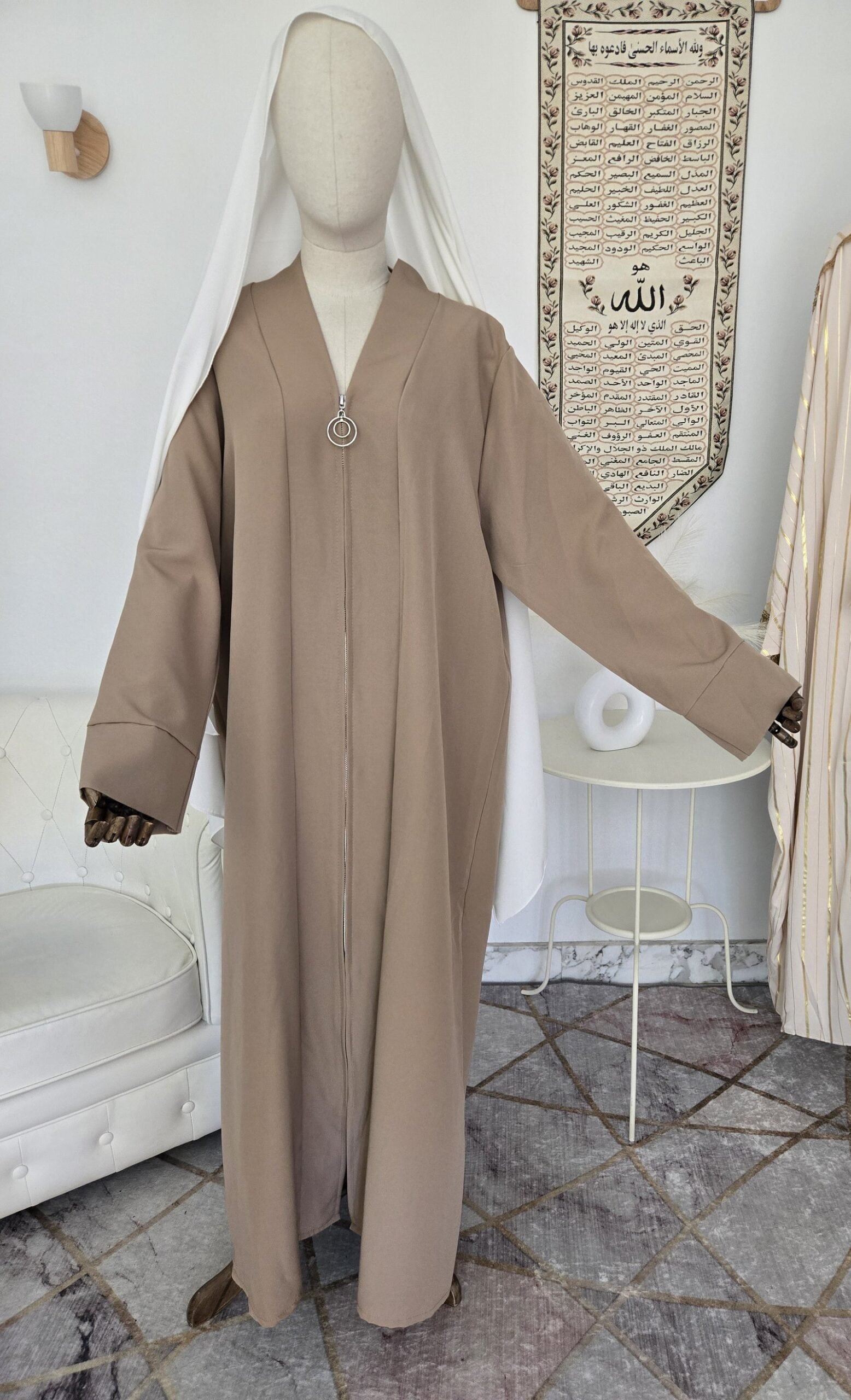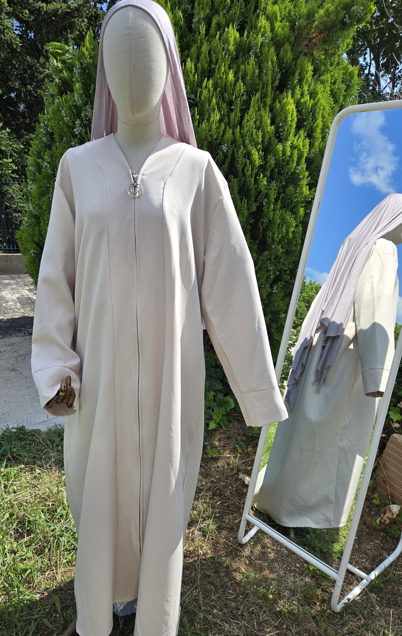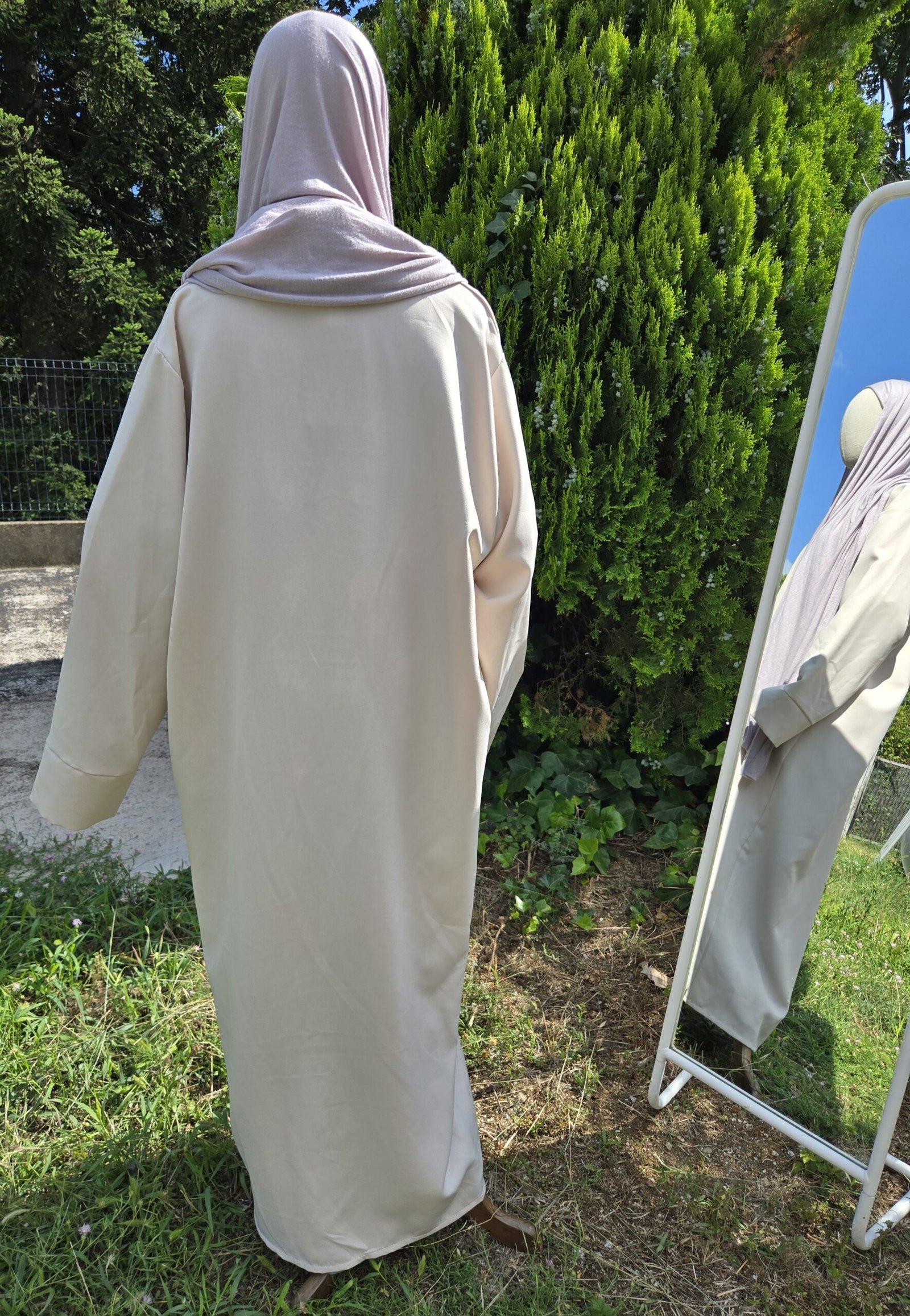 Un diseño que fusiona lo clásico con lo espiritual. Este vestido largo de corte holgado, en tono beige suave, que aporta comodidad sin perder elegancia. Sus mangas largas y su caída recta evocan una estética tradicional. Con cremallera.