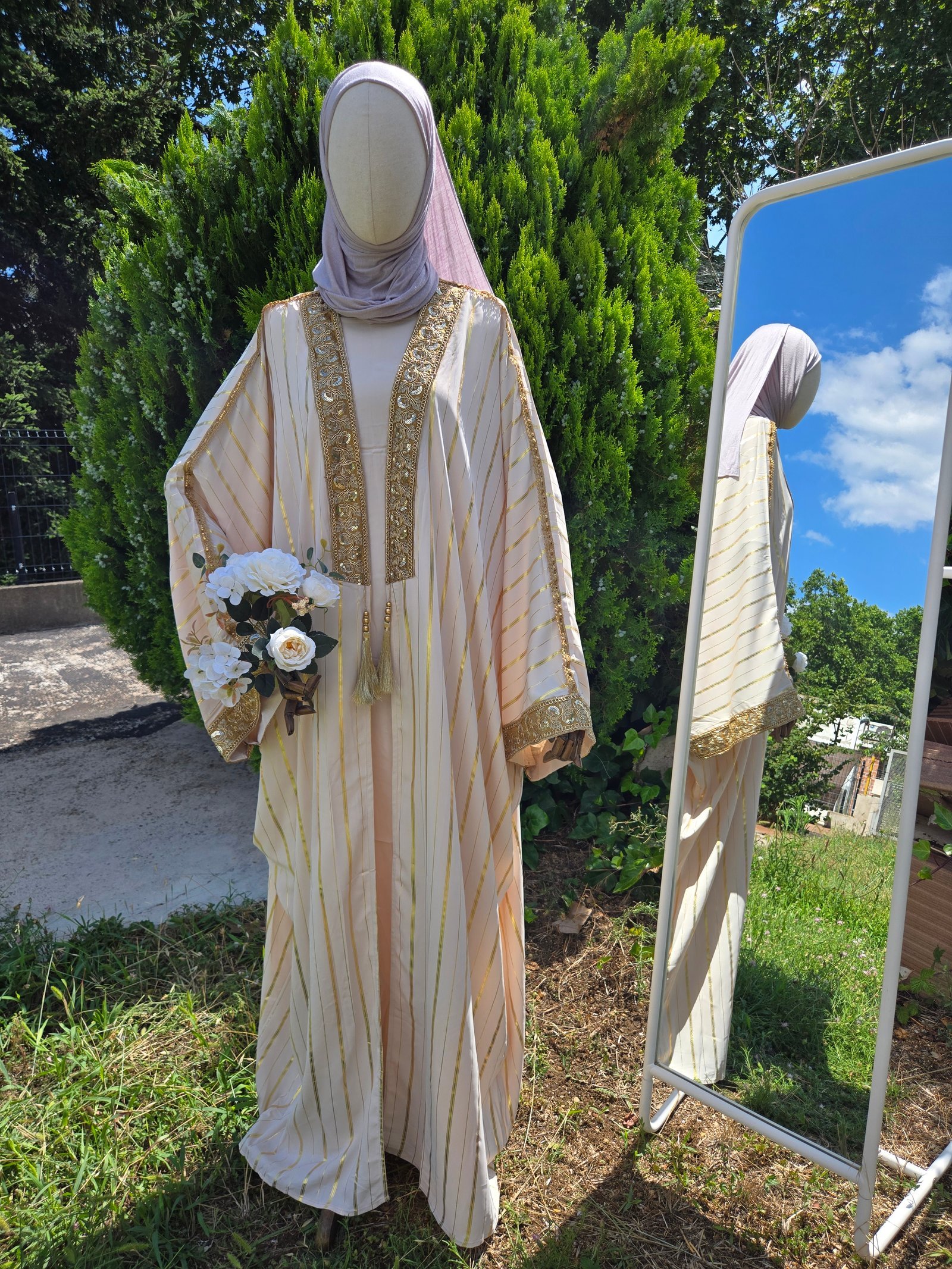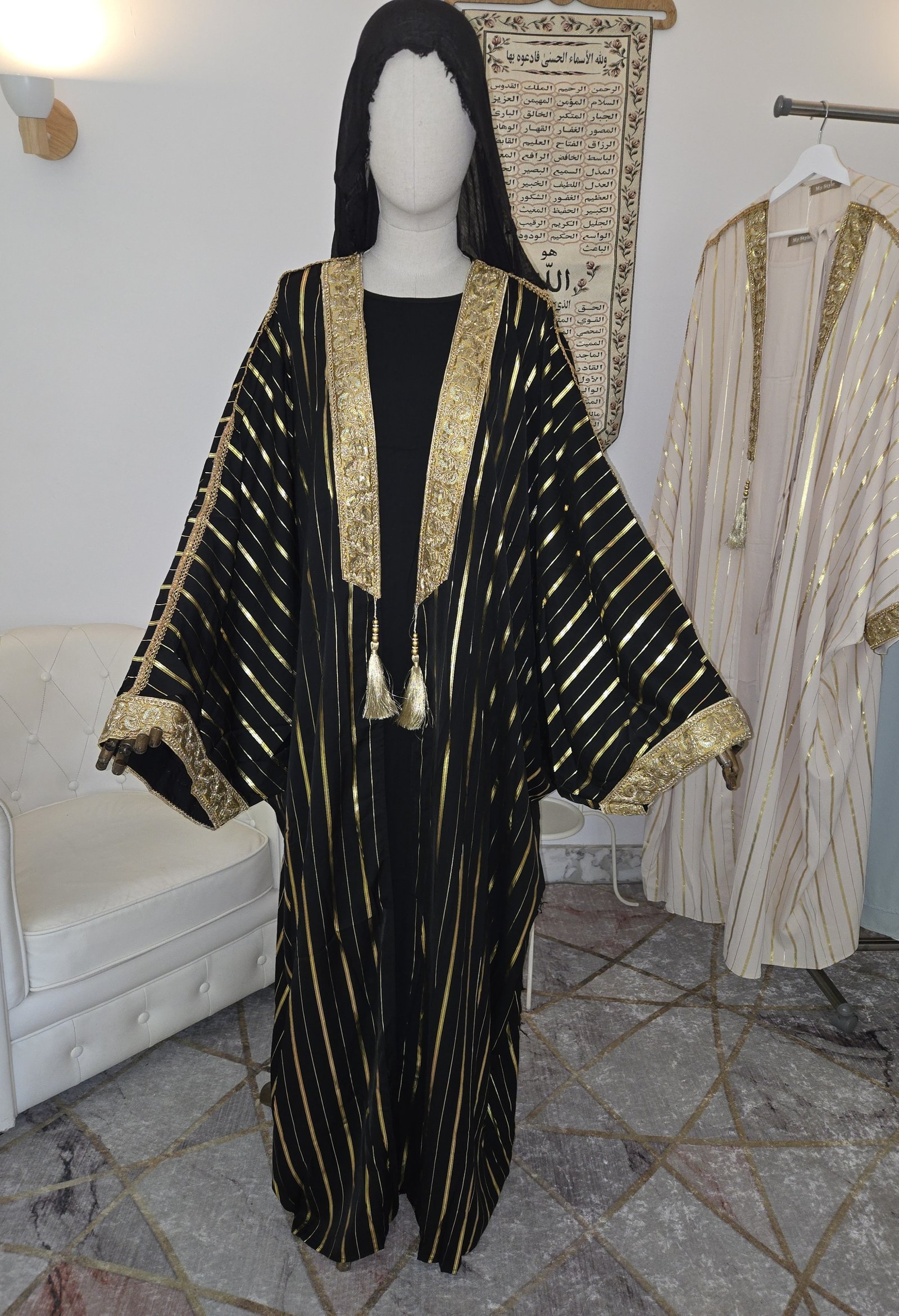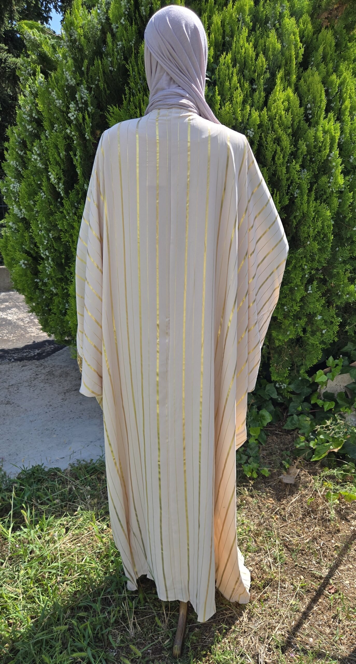 Elegancia y sofisticación se unen en este impresionante vestido de corte tradicional, confeccionado en un tejido ligero color crema con delicadas rayas doradas que aportan un brillo sutil. Su diseño de manga larga y amplia destaca por los bordados dorados en puños y parte frontal, creando una silueta majestuosa y refinada. El detalle central en el pecho con adorno colgante añade un toque artesanal único.