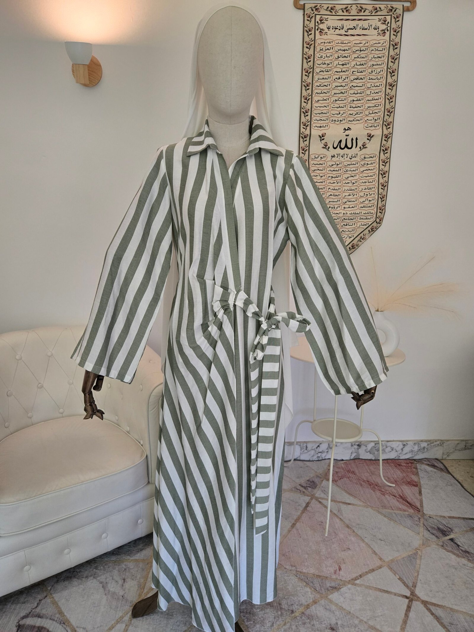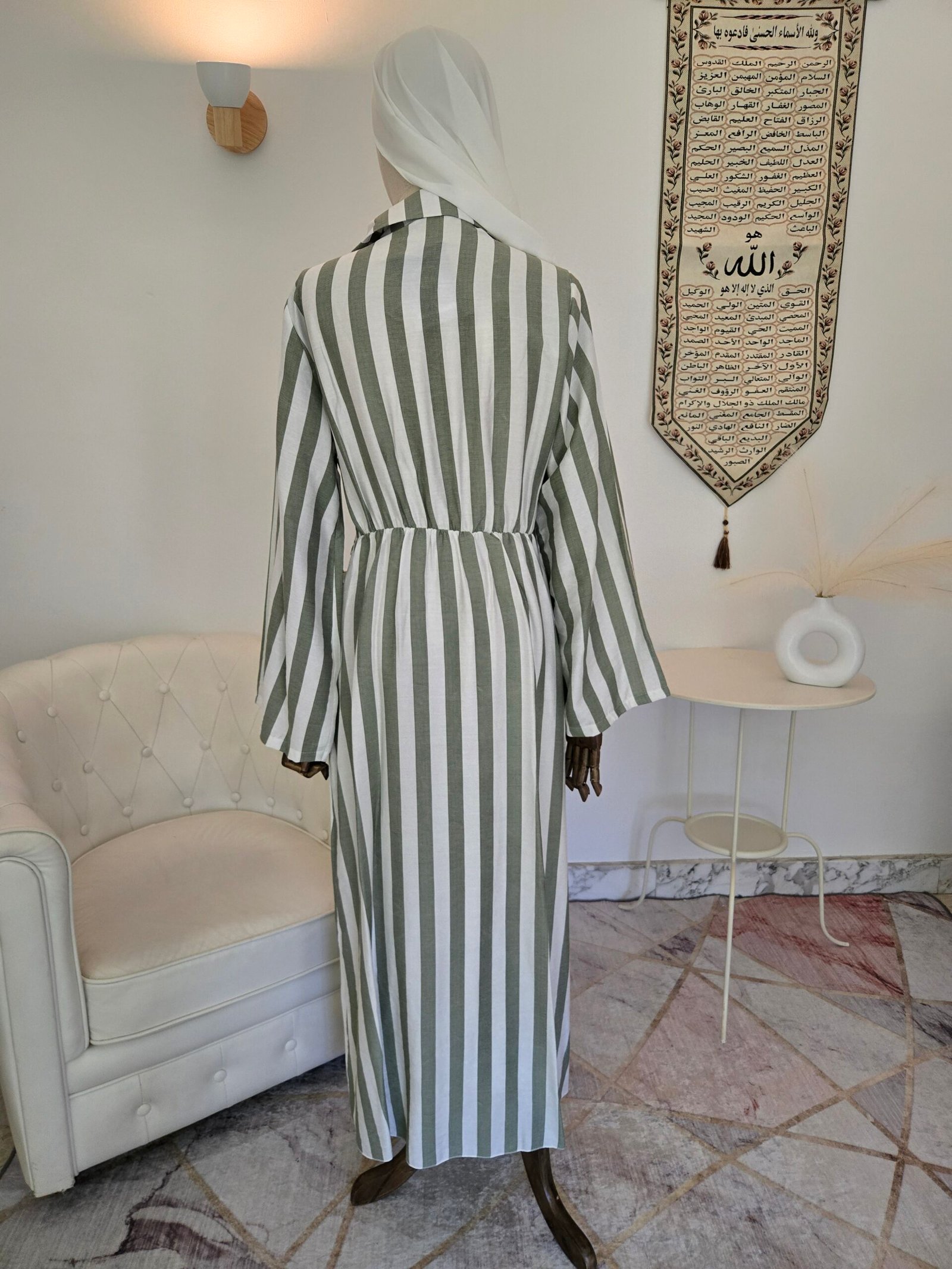 Refinamiento natural con estilo moderno: Este vestido largo a rayas en blanco y verde transmite frescura, serenidad y elegancia atemporal. Perfecto tanto para looks casuales como para ocasiones especiales en interiores.